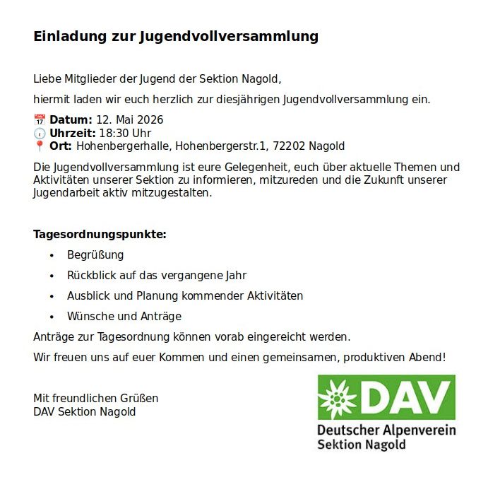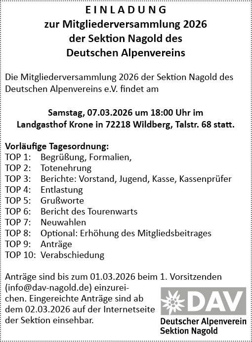 Wir freuen uns Sie bei der Sektion Nagold des Deutschen Alpenverein e.V. zu begrüßen. Die Sektion Nagold wurde im April 2015 neu gegründet und ging aus der Bezirksgruppe Nagold hervor. Wir sind in Nagold der erste Ansprechpartner für alle Sportarten im Outdoor und Alpinen Bereich wie: