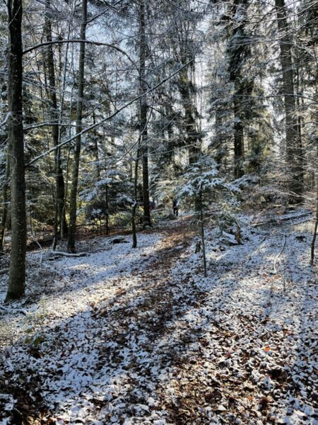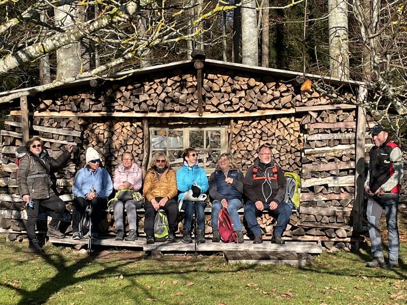 Im November führte uns die Wanderung nach Kälberbronn. Willy hat für uns eine schöne Runde in seiner Heimat überlegt. Der Treffpunkt und Start der Tour war beim Kuhstall in Kälberbronn. Auf der Sonnenseite ging es am Waldrand entlang. Hier erklärte er uns, dass dies das Naturschutzgebiet „Große Tannen“ ist. Das Gebiet wurde bereits im Jahr 1989 als Bannwald mit einer Größe von 13,3 Hektar ausgewiesen. In dem Tannen-Buchenwald wurde im Jahr 1997 die höchste Tanne des Schwarzwalds mit 55 m gemessen, diese ist jedoch beim Sturm Lothar im Jahr 1999 umgefallen. Es gibt jedoch noch Baumriesen mit bis zu 51 Meter hoch und bis zu einem Einzelstamminhalt von 34 fm. Die stärkste Rotbuche erreicht eine Höhe von 41 Metern. Größtenteils sind sie jedoch abgestorben. Direkt am Weg sah man noch einige beeindruckende Baumstümpfe.