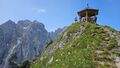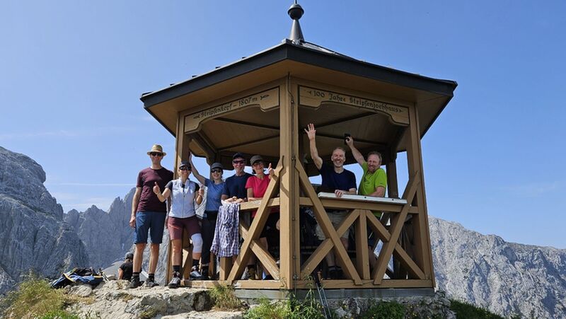 Der zweite Tag auf dem Weg zum Stripsenkopf war von mehreren Highlights geprägt: Einer Kletter-Leiter-Partie im Anstieg, einem kurzen Stop-Over im Stripsenjochhaus (das kommt noch öfter) und dann mit dem Stripsenkopf unser erster Gipfel. Dorthin hatte die Sektion Neuötting vor 101 Jahren einen Pavillon gebaut, der in 2002 wiederum von Neuötting erneuert wurde. Man hat ja sonst nix sinnstiftendes zu tun. Praktischerweise hatten wir 2 Bergfreunde von Neuötting in unserer Gruppe, sodass wir entsprechende Einblicke aus erster Hand bekamen. Den Rückweg mussten wir wegen aufziehendem Gewitter etwas einkürzen und daher wieder über das Stripsenjochhaus führen. Gut so, denn für eine Einkehr und sehr leckeren Eiskaffee hat die Zeit noch gereicht. Mit den ersten Regentropfen waren wir am frühen Nachmittag wieder im Hans-Berger-Haus. Zum Zeitvertreib und zur Weiterbildung hatten Stefanie und Dominik (Neuötting) eine Präsentation zum Thema „Anwendung von Tourplanungs-Apps“ vorbereitet. Die vielen Fragen und Kommentare haben gezeigt, dass es doch einiges zu beachten und zu entdecken gibt!
