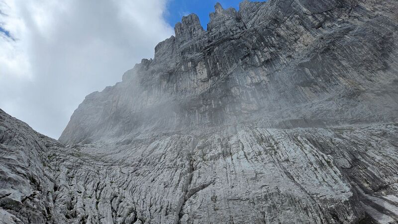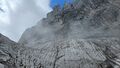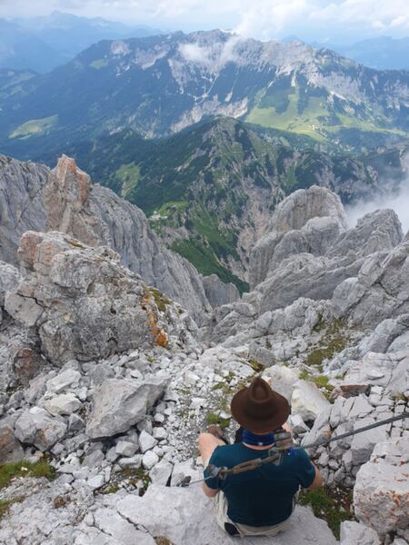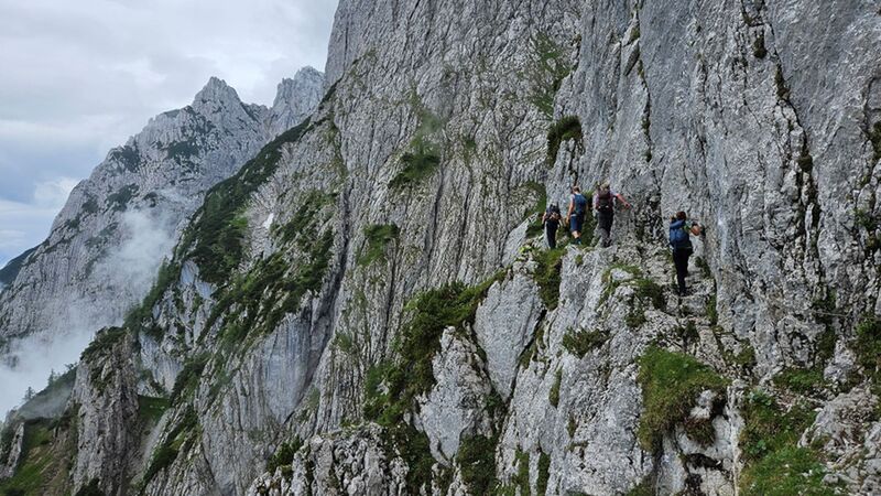 Nach den ersten beiden Tagen waren wir fit für die Highlighttour, die die Hintere Goinger Halt (2194m) zum Ziel hatte und gut 1500 Höhenmeter beinhaltete. Der Weg dorthin führte als Erstes – klar – über das Stripsenjochhaus, den recht anspruchsvoll zu gehenden Egger-Steig und die Steinerne Rinne bis zum Ellmauer Tor. Ein kleines Schneefeld war auch zu queren. Unterwegs wurden wir von teils kritisch, aber überwiegend sehr entspannt dreinschauenden Gämsen beäugt. Wahrscheinlich haben die sich überlegt ob sie uns ein wenig anschieben sollten, denn anstrengend war’s allemal und das konnte man uns ansehen. Außer bei Jürgen, der wie immer blendend aussah (sorry, Jürgen, nix für ungut, der Insider musste sein). Leider war die Aussicht nach dem Regen vom Vortag durch Nebel und Wolken stark eingeschränkt. Dennoch: Allein schon die dramatische Kulisse der senkrecht aufragenden Felsen auf unserem Weg war jede Mühe wert. Dafür hielten sich die Temperaturen in einem sehr viel angenehmeren Bereich. Mit dem guten Gefühl, den Berg geschafft zu haben, ging es zurück zum – nein,doch,aargh (frei nach Louis de Funès) – Stripsenjochhaus. Diesmal wieder mit Einkehr und hochverdientem Eiskaffee.