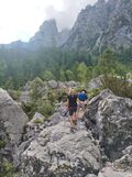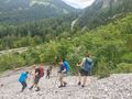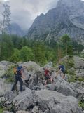 Am Samstag hieß es dann wieder packen für den Abmarsch. Vorher haben wir aber noch eine in Teilen spaßige Lehr- und Übungseinheit in Sachen Bewegen im Blockgelände, auf Schotterhängen und im Schrofengelände absolviert. Währen Schrofen echt anspruchsvoll zu begehen sind, lag der Spaßfaktor eindeutig beim Blockgelände. Welcher Brocken wackelt, welcher bietet einen sicheren Tritt, wie finde ich einen geeigneten Weg? Nach anfänglichem vorsichtigen Herantasten (das darf wörtlich genommen werden) haben wir uns immer sicherer durch unseren „Parcours“ bewegt. Nur die Eispickel, die Dominik mitgeschleppt hat, sind mangels geeigneten Untergrunds (bei vorher tagelang 30°C) dann doch nicht zum Einsatz gekommen.
