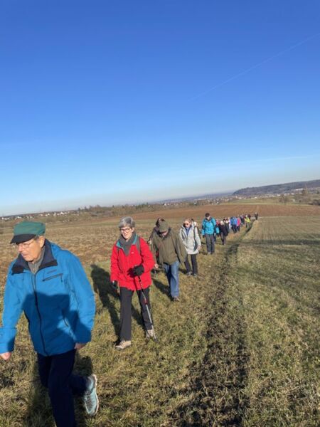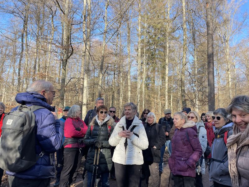 Bei sonnigem, 6 Grad warmen Wetter, starteten wir zu unserer Panorama-Rundwanderung. Zuerst ging es in den Spitalwald. Der Weg war von einigen historischen Grenzsteinen markiert, die die Grenze zwischen dem Herrenberger und dem Haslacher Gemeindewald markieren. Es gab dazu einige Infotafeln. Unser Wanderfreund Eckhart Kern erzählte uns einiges über die Entstehung und Geschichte des Spitalwalds, das eng mit der sozialen und wirtschaftlichen Entwicklung der Stadt Herrenberg verbunden und seine Wurzeln um 1400 hat. Die Pause wurde am Jagdhausweg bei der Wanderhütte eingelegt. Hier hat uns unser Neuzugang, Matthias, einiges über die Geschichte der Hütte und frühere Nutzung als 1. Mai Festplatzes mit Tanzbühne erzählt, sowie interessantes über den geplanten Bau der Windkraftanlagen im Spitalwald.
