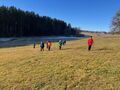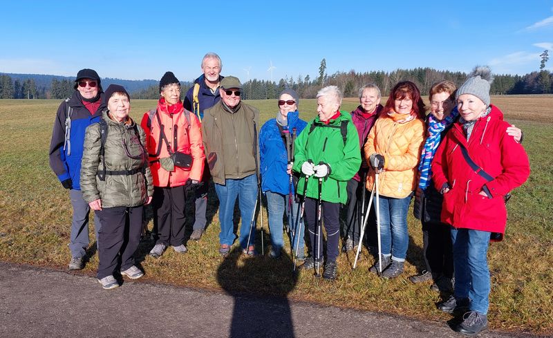Wir waren eine schöne Gruppe von 11 Leuten. Nach vielen Nebeltagen verwöhnte uns genau an diesem Tag ein strahlend blauer Himmel. Von Pfalzgrafenweiler aus gingen wir ein Stück des Jubiläumswegs, hinter dem Heuwasenhof entlang und über den Segelflugplatz, dann bogen wir nach Durrweiler ab, und von dort weiter hinunter bis an den Waldrand am Langenhardteck. Durch das urige Weiherbachtal konnten wir nicht wandern, da der Weg zu sehr vereist war. Aber da die Kühe noch nicht draußen auf der Weide und die Elektrozäune deshalb noch nicht geladen waren, konnten wir problemlos auf die ausgedehnten Wiesen ausweichen, und kamen dann irgendwann auch auf den vorgesehenen Weg, der uns in weitem Bogen, zum Schluss vorbei an einer ehemaligen Burganlage, zurück nach Pfalzgrafenweiler führte.